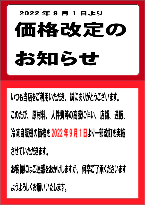 価格改定のお知らせいつも当店をご利用いただき、誠にありがとうございます。このたび、原材料、人件費等の高騰に伴い、店舗、通販、冷凍自販機の販売価格を2022年9月1日より一部改訂を実施させていただき…