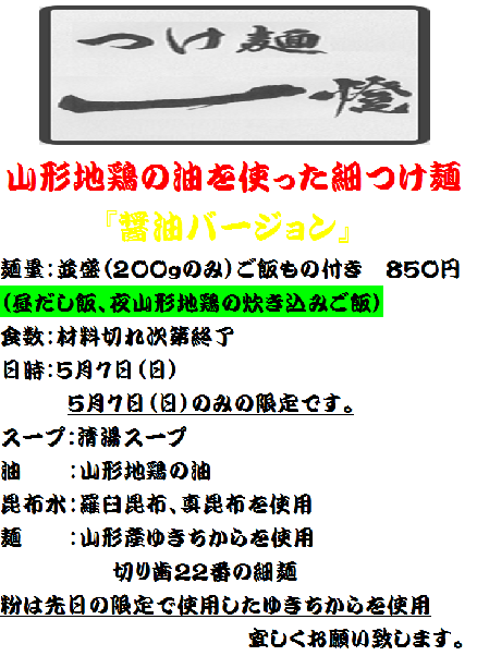 つけ麺一燈より5/7(日)の限定のお知らせ