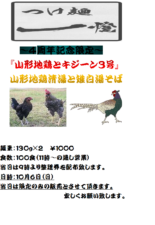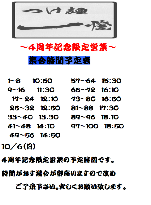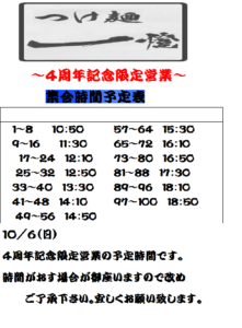 つけ麺一燈より10/6(日)4周年年記念予定表