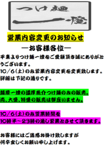 つけ麺一燈より10/6(土)営業内容変更のお知らせ
