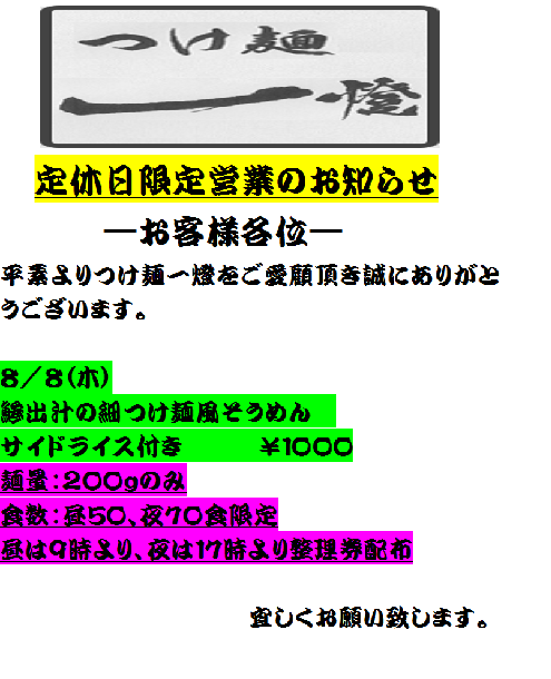 つけ麺一燈より8/8(木)定休日限定営業のお知らせ