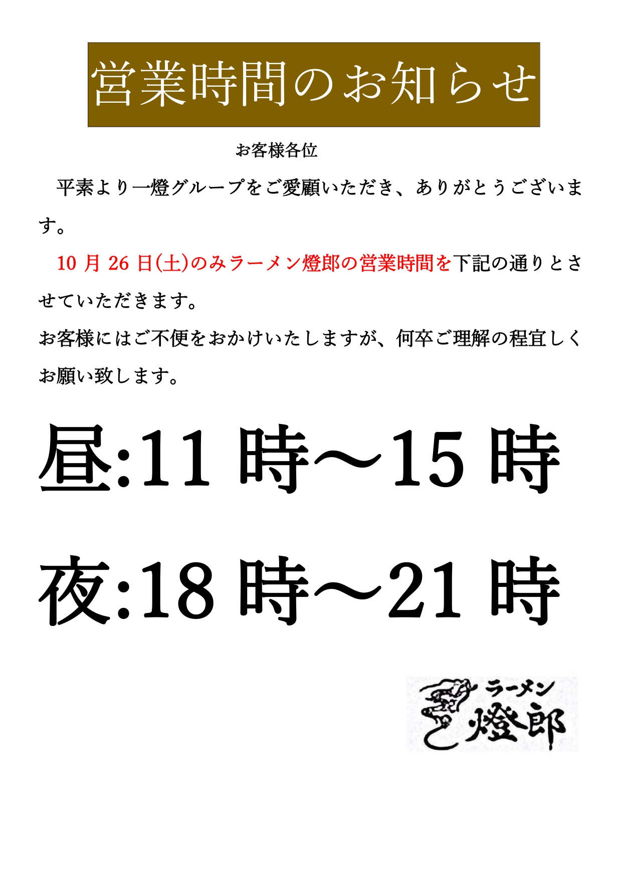 ラーメン燈郎より営業時間のお知らせ 2019.10.24 10月26日(土)のみ営業時間の変更がございます。 プラチナ会員様限定で11時30分からご予約を頂いているお客様は11時からでも提供可能なご用意をしていますのでよろしくお願い致します。
