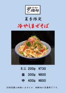 ラーメン燈郎より夏季限定のお知らせ 2017.07.13 7/19(水)より夏季限定で「冷やしまぜそば」を提供致します。 期間中は毎日提供し、限定数は設けませんが、 材料切れ次第終了とさせていただきます。 尚、火曜日は定休日となっております。 よろしくお願い致します。