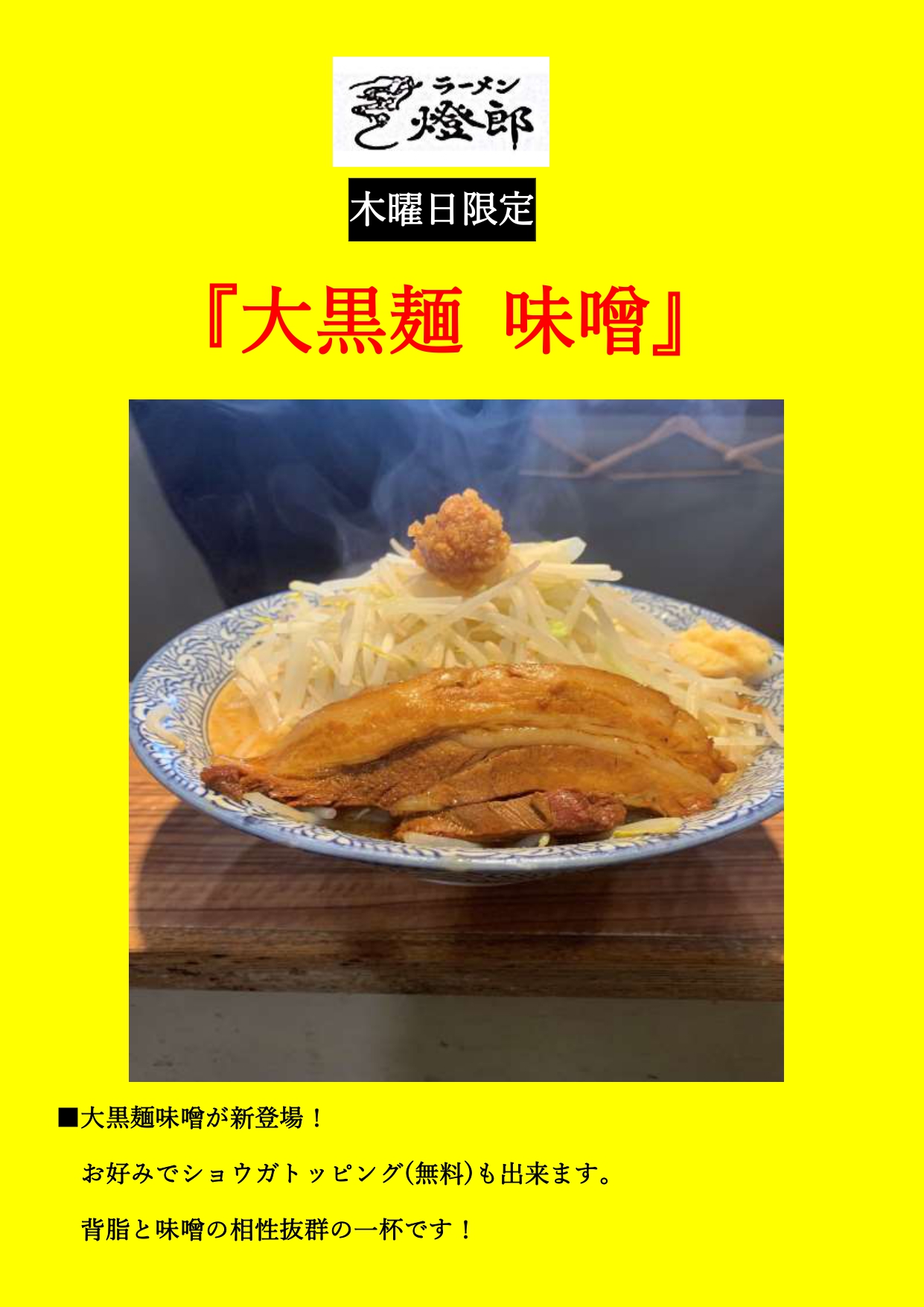 ラーメン燈郎木曜限定 大黒味噌のお知らせ