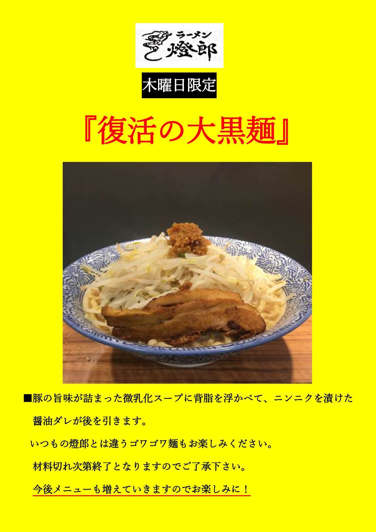 ラーメン燈郎木曜限定のお知らせ