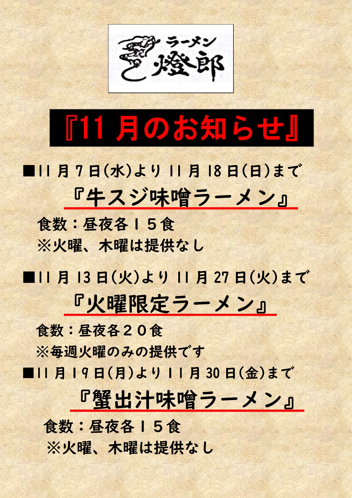 ラーメン燈郎11月のお知らせ