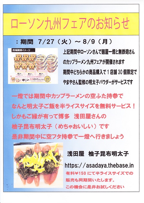 一燈では期間中一燈のカップラーメンの空フタ持参で、なんと明太子ご飯を半ライスサイズ無料サービスさせていただきます。