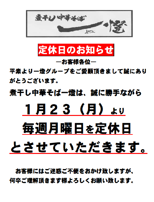 煮干し中華そば一燈よりお知らせ