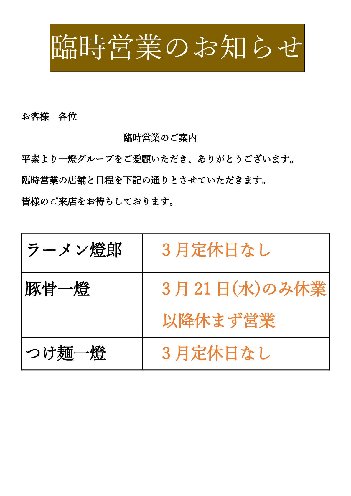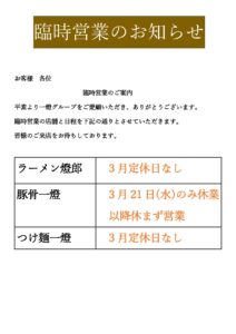 臨時営業のお知らせ