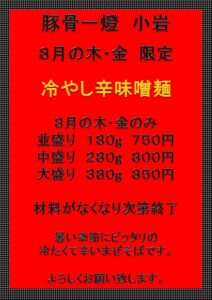 豚骨一燈小岩 木金限定のお知らせ