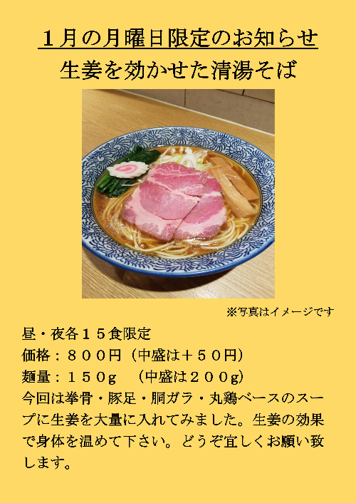 麺屋一燈より1月の月曜日限定のお知らせです。