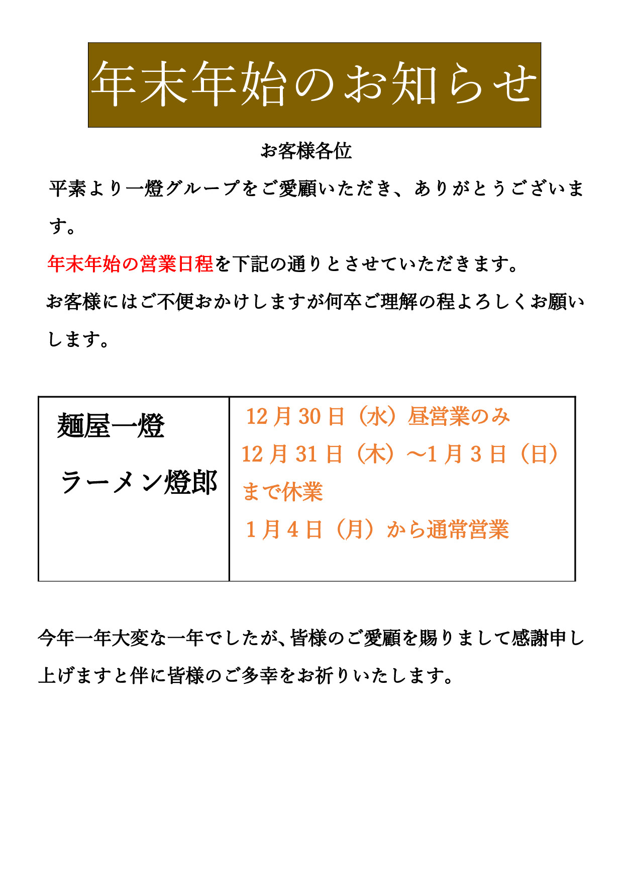 麺屋一燈よりお知らせです 2020.11.23 麺屋一燈よりお知らせです。 ⓵11月の第4水曜日の営業時間のお知らせです。 お客様にはご迷惑おかけしますがどうぞ宜しくお願い致します。 ⓶年末年始の営業のお知らせです。 今年も残り少なくなってまいりましたが、どうぞ宜しくお願い致します。