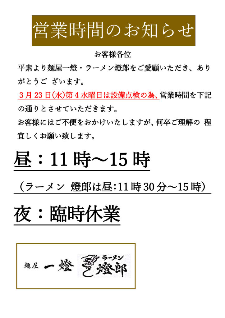 麺屋一燈よりお知らせです 2022.03.21 ①麺屋一燈より夜の営業時間のお知らせです。 明日22日よりまん延防止等重点措置が解除されますので麺屋一燈及びラーメン燈郎の夜営業の時間が通常通り 麺屋一燈 18時~21時 ラーメン燈郎 18時~22時 となります。 ②第4水曜日の営業時間のお知らせです。 23日(水)は第4水曜日ですので、麺屋一燈及びラーメン燈郎は設備点検の為昼営業のみで夜営業はございません。 お客様にはご迷惑おかけしますがどうぞ宜しくお願い致します。