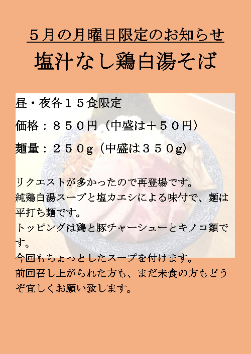 5月の月曜日限定のお知らせです。