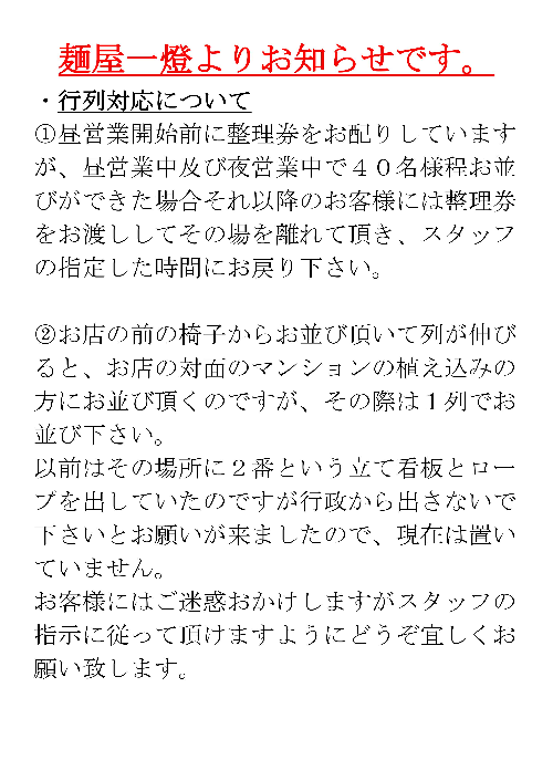 麺屋一燈より行列対応についてお知らせです。