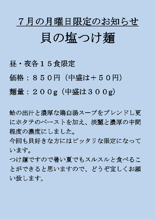麺屋一燈より7月の月曜日限定のお知らせです。 2017.06.25 おはようございます。 7月の月曜日限定のお知らせです。 どうぞ宜しくお願い致します。 6月の月曜日限定も後1回ありますので、合わせて宜しくお願い致します。