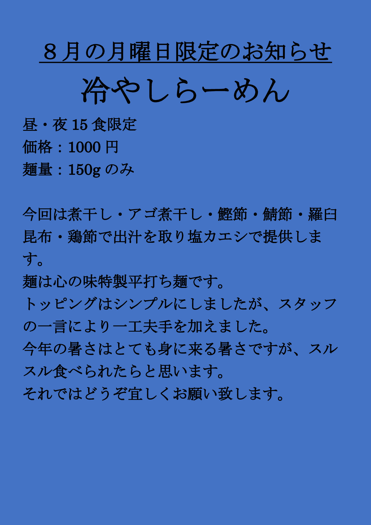 麺屋一燈より8月の月曜日限定のお知らせです。