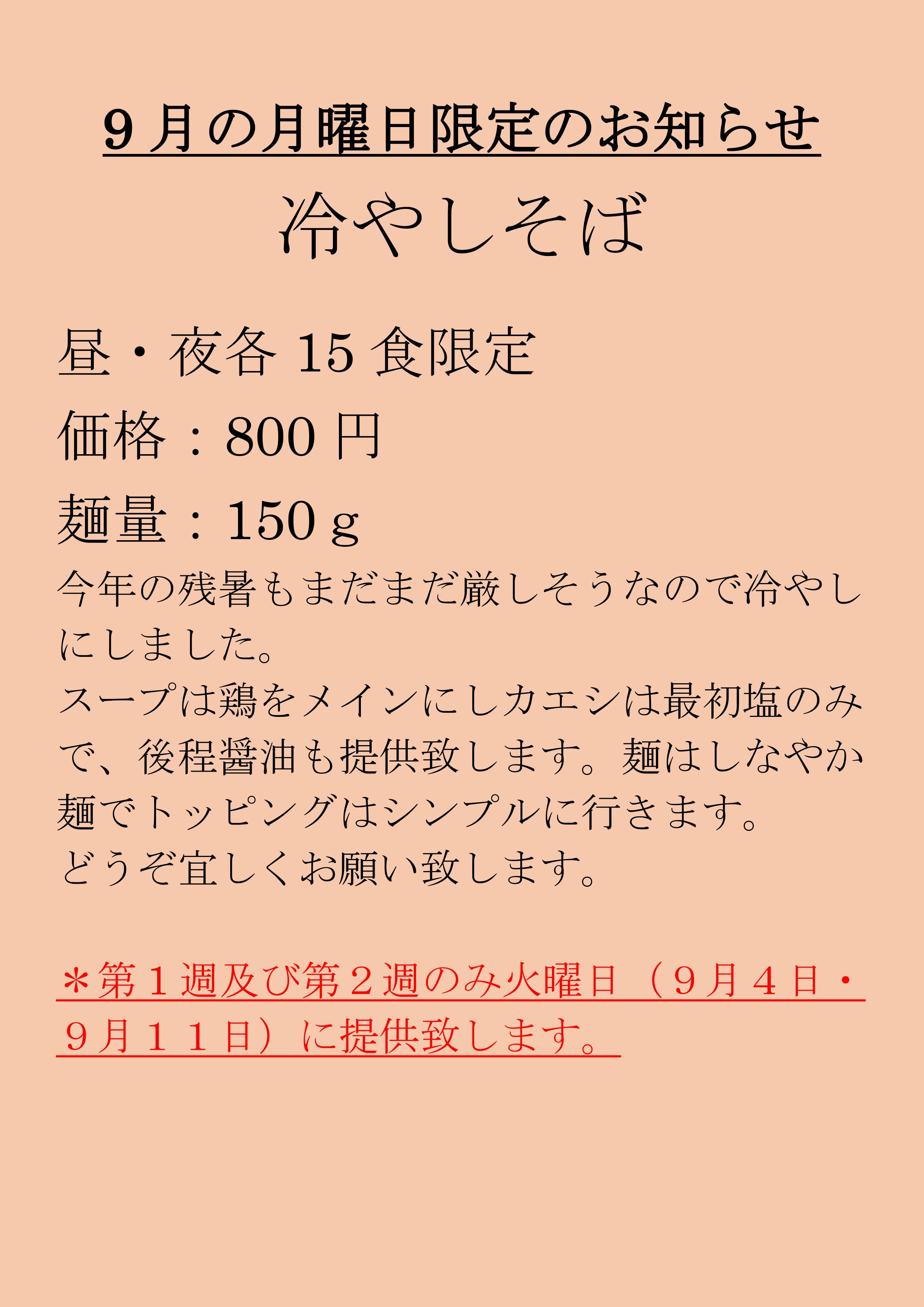 麺屋一燈より9月の月曜日限定のお知らせです 2018.08.30 おはようございます。 9月の月曜日限定のお知らせです。 どうぞ宜しくお願い致します。 尚、第1週及び第2週のみ火曜日(9月4日・9月11日)に提供致します。