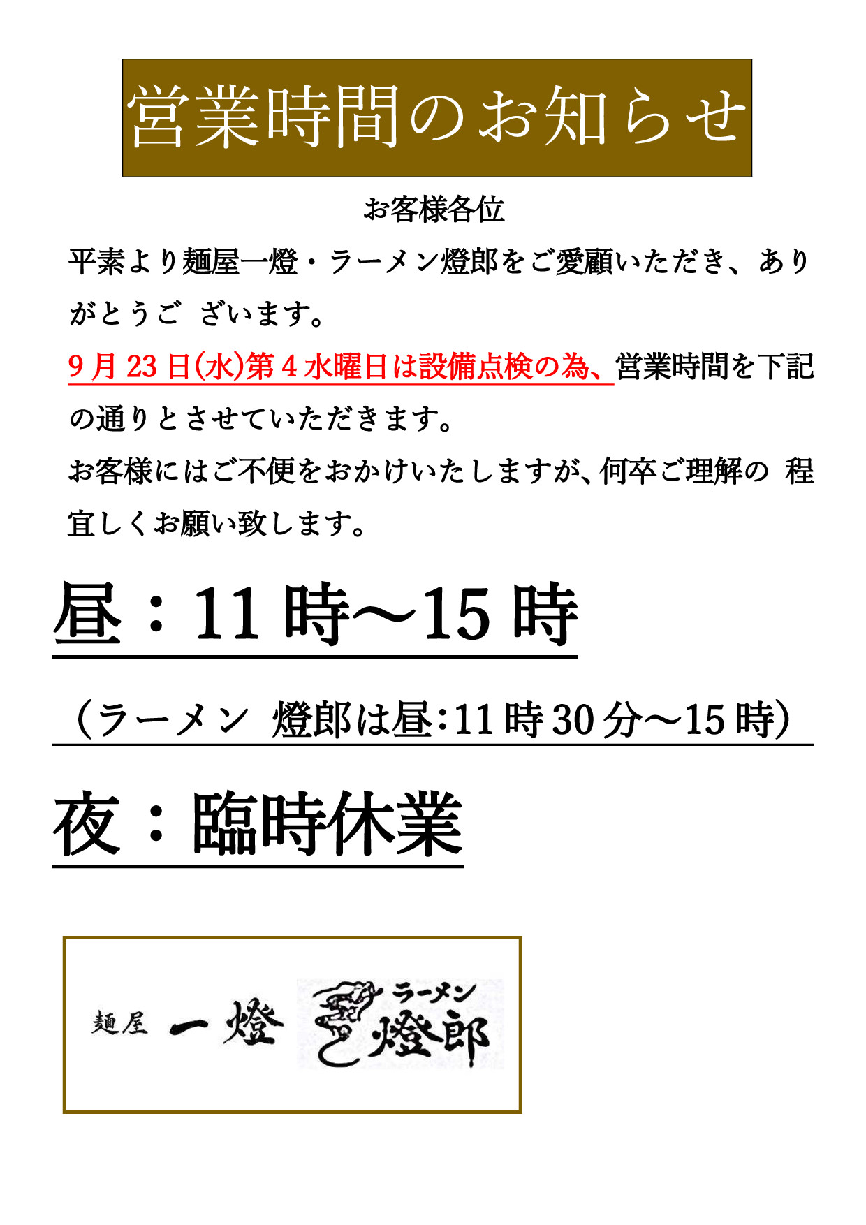 麺屋一燈より9月の第4水曜日の営業時間のお知らせです