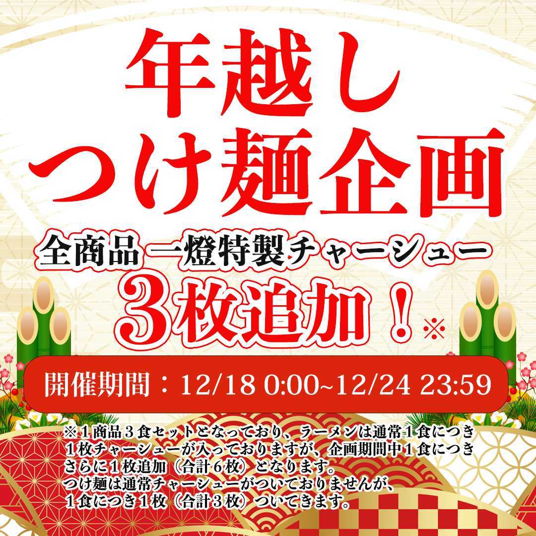(修正版)年越しつけ麺企画のお知らせ 2021.12.17 今朝配信に誤りがございましたので、訂正して再度配信させていただきます。 ご迷惑をお掛けして誠に申し訳ございませんでした。 通販サイトにて、12/18(土)0:00から12/24(金)23:59までの期間 通販用チャーシューがそれぞれ1枚サービスとなります。 ラーメンでは通常1食につき1枚が2枚。 つけ麺では通常つかないですが1食につき1枚サービスとなります。 この期間に是非ご購入いただき、年末年始の楽しいひと時をお過ごしいただけたらと思います。 何卒よろしくお願い申し上げます。