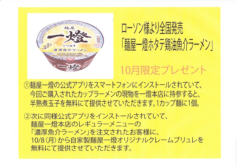 10/8(月)から店舗で作った麺屋一燈オリジナルクレームブリュレを無料にて提供させていただきます。