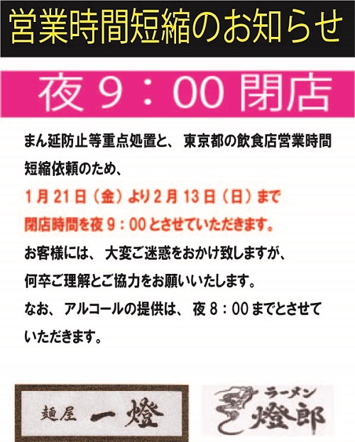 まん延防止等重点処置と、東京都の飲食店営業時間短縮依頼のため1/21~2/13まで閉店時間を21:00アルコールの提供は20:00までとさせていただきます。お客様には大変ご迷惑をおかけ致しますが…