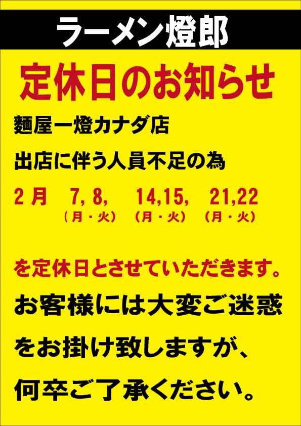 いつも大変お世話になっております。ラーメン燈郎ですが、麵屋一燈カナダ出店に伴う人員不足のため、2月7(月)・8(火)・14(月)・15(火)・21(月)・22(火)を定休日とさせていただきます。…