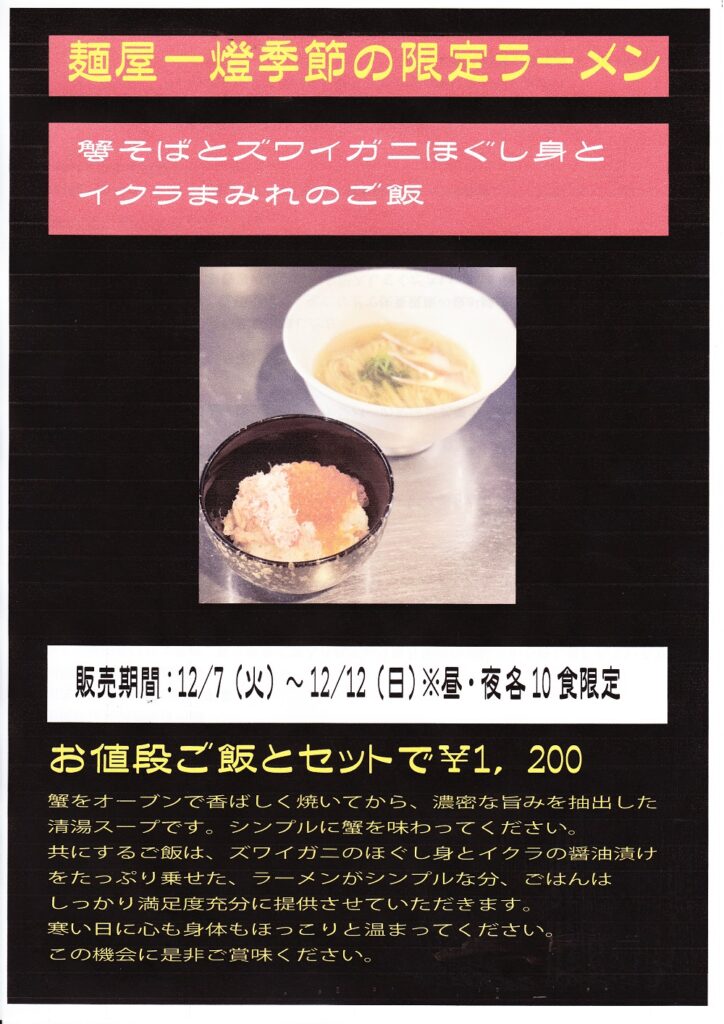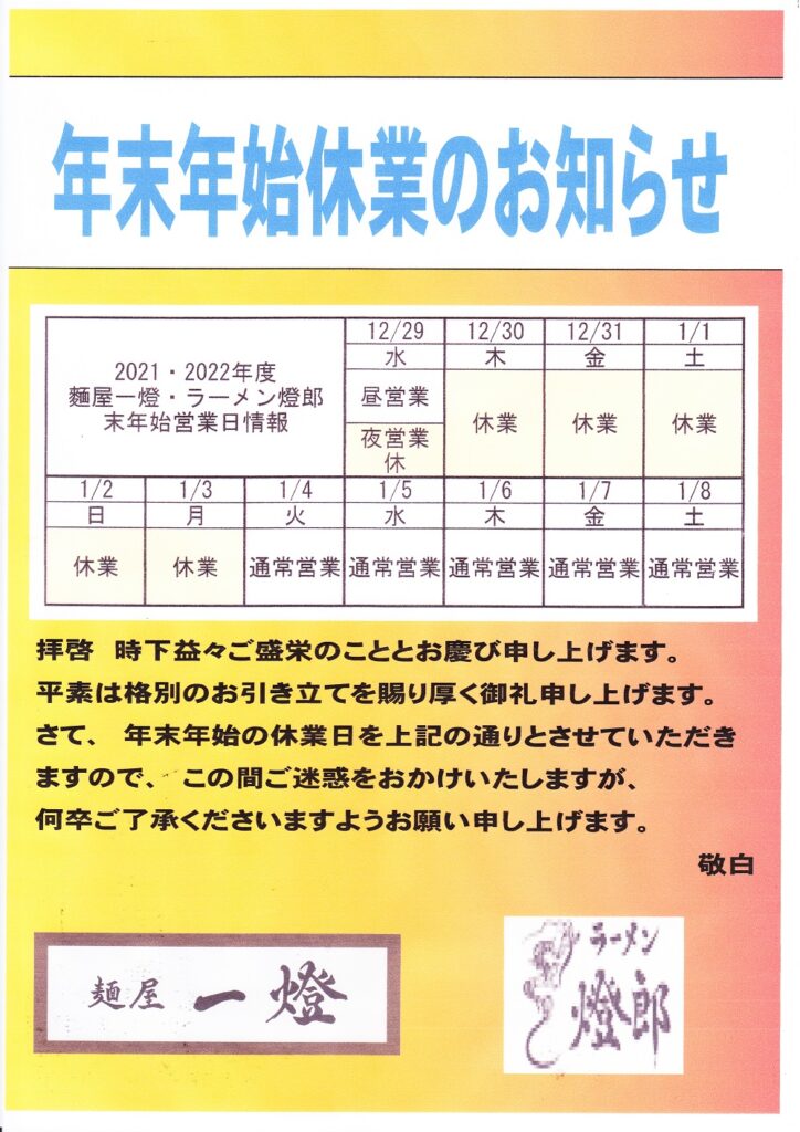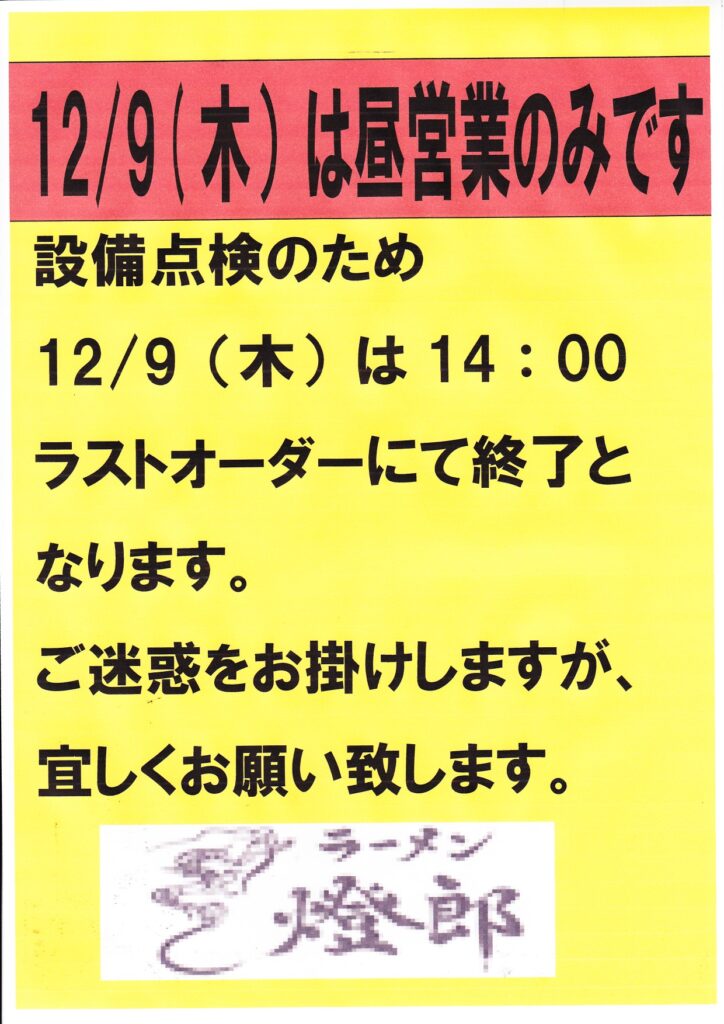 ラーメン燈郎12/9(木)は昼営業のみとなります