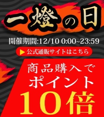 いつもご利用いただきありがとうございます。一燈の日12/10(金)0:00~23:59まで公式通販でご購入するとポイント10倍キャンペーンを行います。この機会に是非ご購入ください。※注意事項…