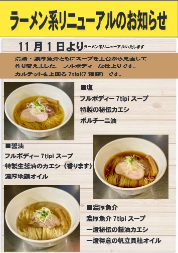 11月1日(月)よりラーメン系3種類のブラッシュアップリニューアルを行います。清湯・濃厚魚介ともにスープを土台から見直して作り変えました。とてもフルボディーな仕上りとなっております。どこかで聞い…
