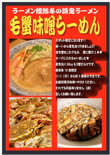 お世話になっております。燈郎の季節の限定『毛蟹味噌ラーメン』は11/18(木)にて販売終了とさせていただきます。たくさんのお客様にご好評いただきありがとうございました。また来年もやりたいと思い…