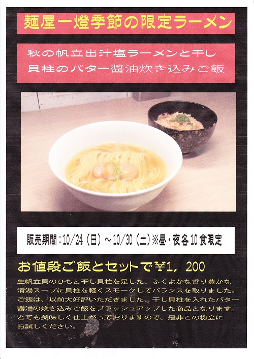 季節の限定ラーメンのお知らせ秋の帆立出汁塩ラーメンと貝柱のバター醬油炊き込みご飯特製清湯スープに帆立貝のひもと貝柱を足したふくよかな香りゆたかなスープに貝柱を軽くスモークしてバランスを取ったスー…