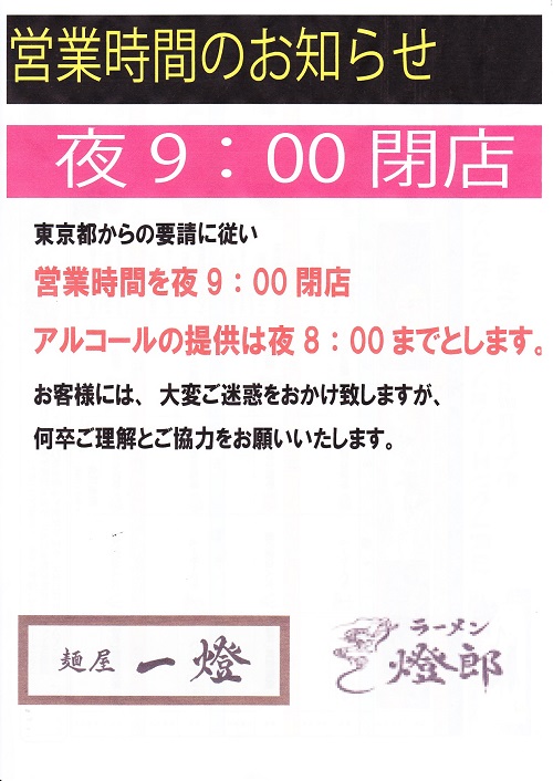 麺屋一燈とラーメン燈郎は10月1日から 閉店時間21:00アルコールの提供は20:00まででの営業となりますので、引き続きよろしくお願いいたします。