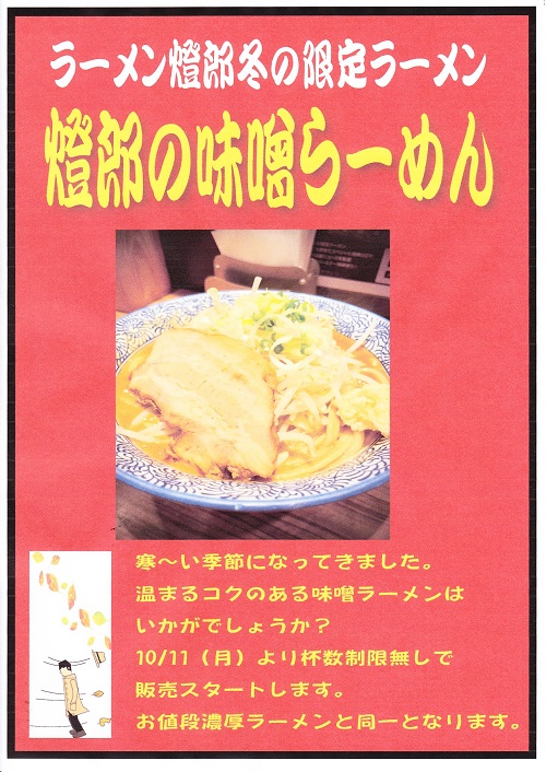燈郎季節の限定味噌ラーメン販売のお知らせ